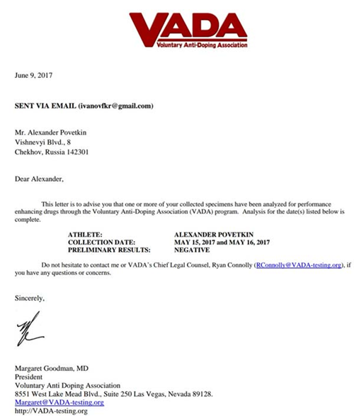 В качестве подтверждение президент VADA Маргарет Гудман направила "Витязю" письмо с уведомлением о негативной допинг-пробе.