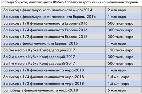 Зарплата Капелло составляет 7 млн евро в год, в период подготовки и игр сборной на чемпионате мира в Бразилии он заработал 4,5 млн евро, а за выход на ЧМ-2014 тренер получил 2 млн евро.