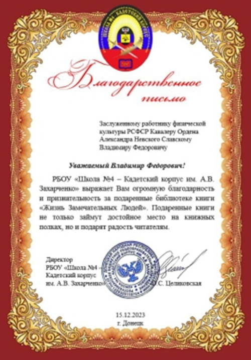 P.S. Благодарственное письмо Владимиру Федоровичу Славскому от директора школы №4 г.Донецка О.С.Целиковской