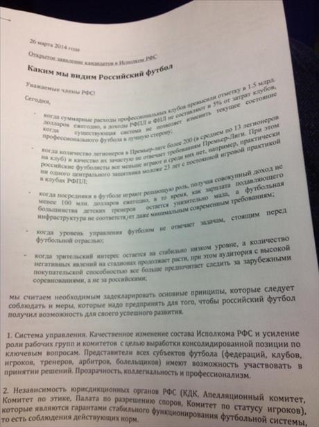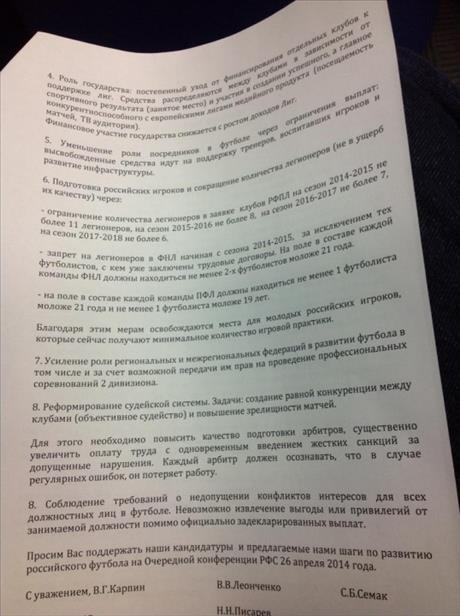 Кандидаты в исполком Валерий Карпин, Владимир Леонченко, Николай Писарев, Сергей Семак и Сергей Родионов огласили главные пункты своей программы.