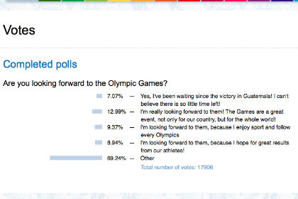 В настоящее время опрос можно найти в разделе "Completed Polls" через карту сайта. Согласно его итогам, на вопрос "Ждете ли вы начала Олимпийских Игр?" в общей сложности ответили 17906 человек. Чуть более семи процентов выбрало вариант "Да, с нетерпением жду еще с победы в Гватемале! Не могу поверить, что осталось так мало времени!"; почти 13 процентов проголосовали за вариант "Очень жду! Игры — великое событие не только для нашей страны, но и для всего мира!"; 9,37 процента отдали голоса за пункт "Жду, потому что увлекаюсь спортом и слежу за каждыми Олимпийскими Играми"; еще 8,94 процента поголосовали за вариант "Жду, потому что надеюсь на хорошие результаты наших спортсменов!"