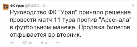 Матч 11-го тура чемпионата России по футболу между "Уралом" и тульским "Арсеналом" состоится в манеже, сообщает официальный твиттер клуба из Екатеринбурга.