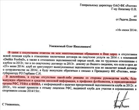 Шесть писем Радича всем высокопоставленным лицам ФК "Ростов" не принесли результата. Ниже приведено последнее письмо Радича в адрес гендиректора "Ростова".