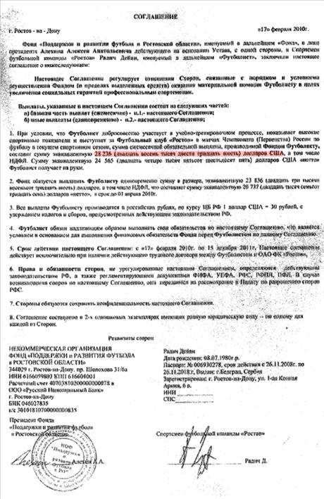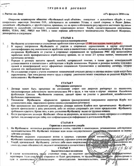 Данную схему подтверждают трудовые договоры бывшего футболиста "Ростова" Деяна Радича. В договорах сербского голкипера прекрасно видно, что заработная плата футболиста по трудовому договору составляет 15 тыс. рублей в месяц.