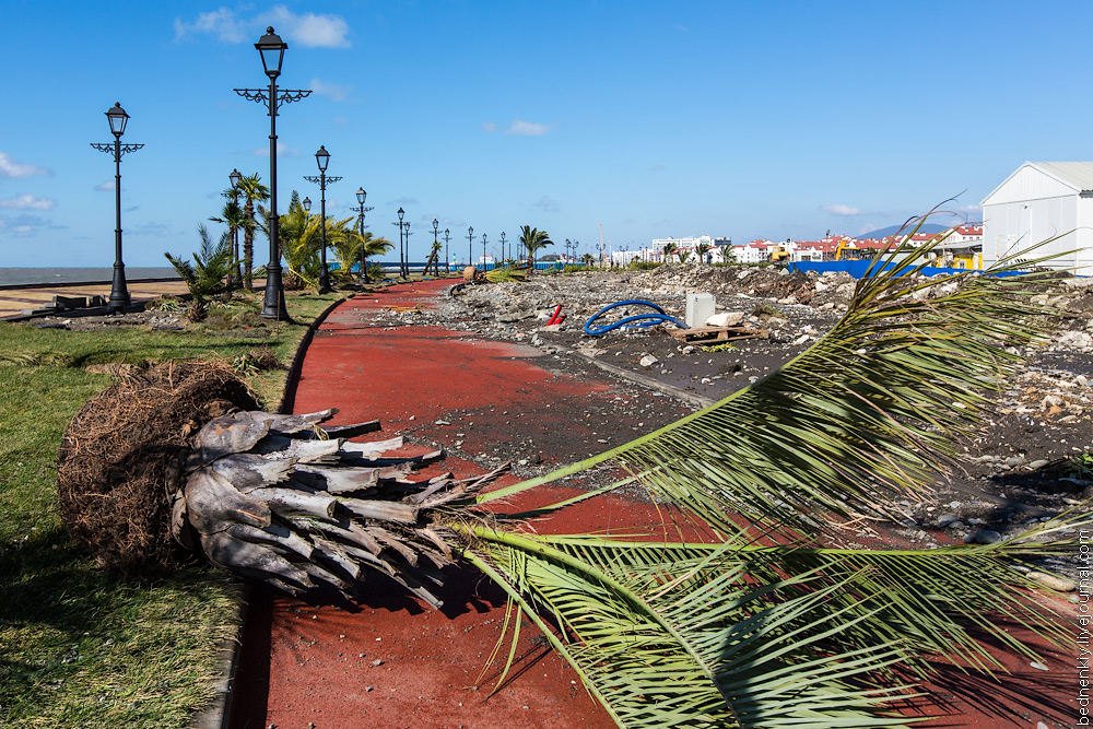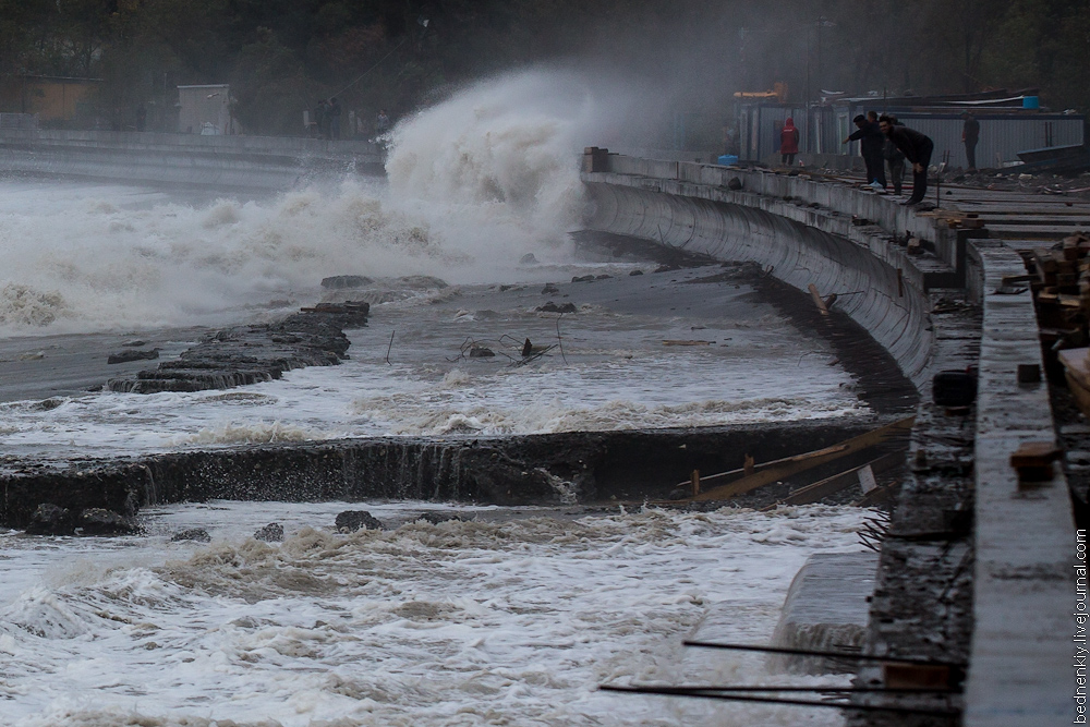 В Сочи в районе Прибрежного олимпийского кластера (нижней олимпийской деревни) очередной шторм вновь нанес разрушения в районе олимпийской стройки, из-за дефицита наносов наблюдается размыв берегов.