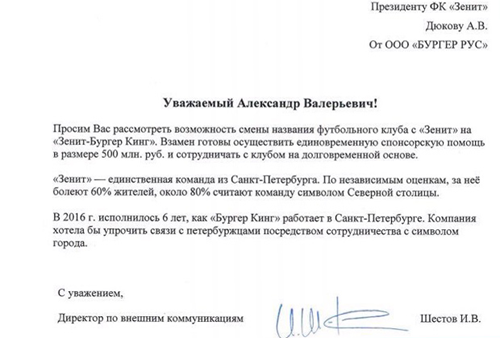 Российское подразделение сети фаст-фуда Burger King (ООО "Бургер Рус") направило президенту санкт-петербургского футбольного клуба "Зенит" Александру Дюкову письмо с предложением переименовать команду в "Зенит-Бургер Кинг". Об этом говорится в релизе "Бургер Рус", поступившем в редакцию "Ленты.ру".