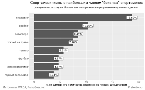 Большинство "больных" атлетов имеют гражданство США и Великобритании — 23% и 22% соответственно. За ними следуют Канада (10%), Германия (8%), Австралия (7%), Дания (6%), Италия (5%) — всего 23 страны.