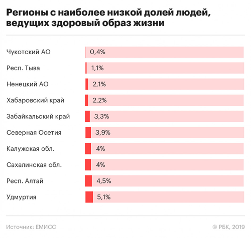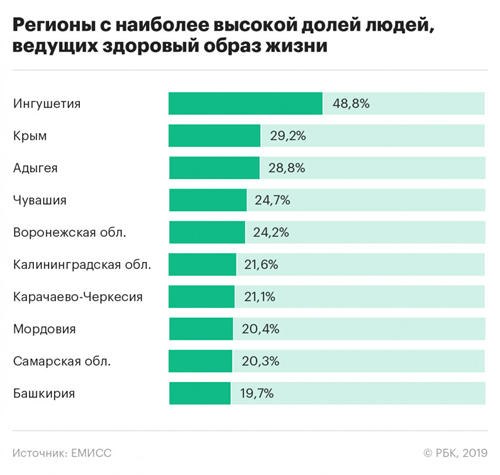Наиболее высокая доля людей, ведущих здоровый образ жизни, в 2019 году зафиксирована в Ингушетии — 48,8%. На втором месте Крым с 29,2%, на третьем — Адыгея с 28,8%. В пятерку лидеров по ЗОЖ также вошли Чувашия (24,7%) и Воронежская область (24,2%). У Москвы этот показатель составляет 8,8%, у Санкт-Петербурга — 6,8%.