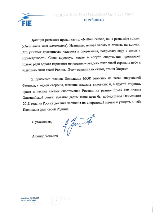 Я пишу это письмо не только как Президент Международной Федерации Фехтования, но, прежде всего, как гражданин России и человек, для которого служение Олимпийским идеалам стало одной из главных целей в жизни.