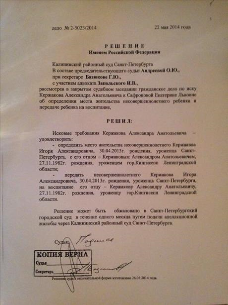 Евгения Семчукова: В Петербурге у неё были подставные адвокаты. Он убедил её подписать иск об определении места жительства ребёнка у Александра, а потом, мол, этот иск будет пересмотрен. Никакого отказа от ребёнка Екатерина не подписывала и не будет подписывать. Сейчас стало ясно, что этот адвокат работает вместе с адвокатами Кержакова.