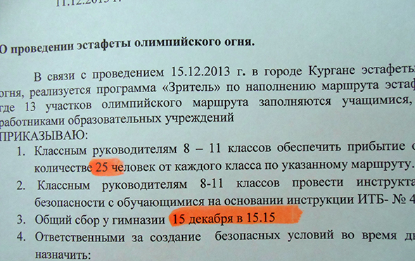 А для достойной встречи Олимпийского огня зрителей, как рассказывают Znak.com курганцы, сгоняют по указке начальства. Приказы обеспечить достойную встречу огня издаются, к примеру, в муниципальных образовательных учреждениях. В документах, один из которых попал в распоряжение Znak.com, в частности, указано, что классным руководителям 8-11 классов необходимо обеспечить прибытие 25 школьников по указанному маршруту.