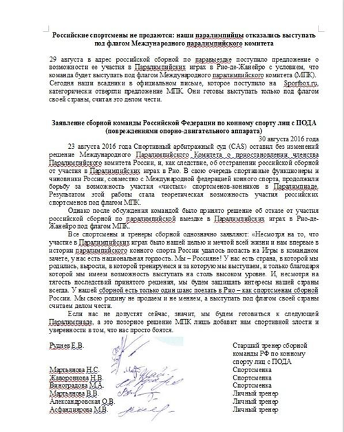 30 августа наши всадники в официальном письме, которое поступило на Sportbox.ru, категорически отвергли предложение IPC. Они готовы выступать только под флагом своей страны, считая это делом чести.