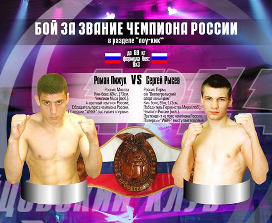 "Арбат") под эгидой Федерации Кикбоксинга России состоится бой за титул ЧЕМПИОНА РОССИИ по профессиональному кикбоксингу в весовой категории до 69 кг (в разделе лоу-кик).