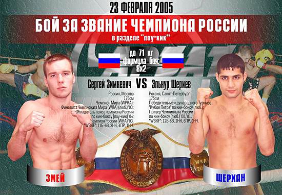 Обладатель пояса - Чемпион России 2004, 2003гг («лоу-кик»), Чемпион Мира по кикбоксингу среди профессионалов Сергей Земневич по прозвищу «ЗМЕЙ» (Россия, г. Москва) против