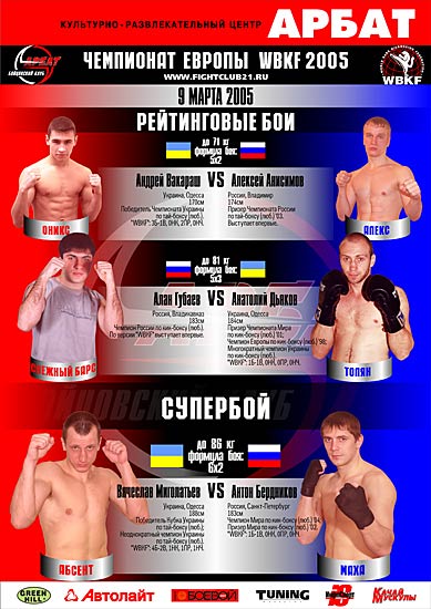 9 марта на ринге Бойцовского Клуба «Арбат» Культурно-развлекательного Центра «Арбат» в рамках Чемпионата Европы WBKF состоятся рейтинговые бои по профессиональному кикбоксингу, а также СУПЕР-БОЙ в весовой категории до 86 кг: