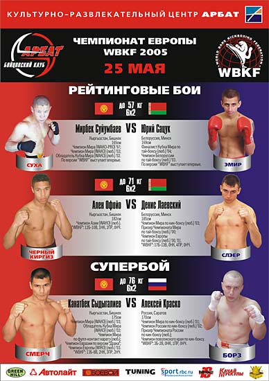 1 бой – рейтинговый в весовой категории до 57 кг Чемпион Мира (WAKO-PRO) 97, Чемпион Мира (WAKO) ’03, Обладатель Кубка Мира по кикбоксингу (WAKO) 02 Мирбек Суйумбаев (Киргизия, г.Бишкек) против Финалиста Кубка Мира 04; Чемпион Белоруссии 03 по тайскому боксу Юрия Сацука (Белоруссия, г.Минск)