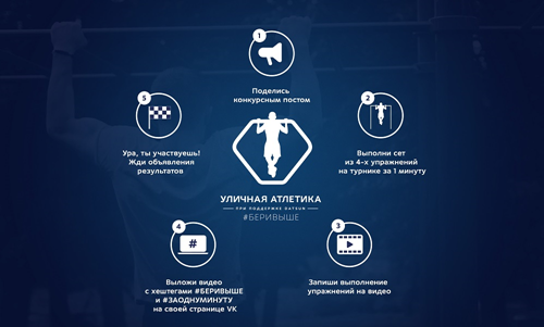 В сети активно распространяется видеоролик, в котором известный спортсмен, актер и телеведущий Сергей Бадюк, являющийся также одним из членов жюри конкурса, призывает опытных, а также начинающих спортсменов попробовать свои силы и рассказывает в чем заключается видео-челлендж. Участникам необходимо за одну минуту выполнить сет из четырех упражнений на турнике, в который входят: выход силой, отжимания, подтягивания и подъем ног к перекладине. Выполнение конкурсного задания нужно записать на видео и опубликовать его у себя на странице в социальной сети ВКонтакте с хэштегами: #БериВыше и #ЗаОднуминуту до 29 октября включительно.