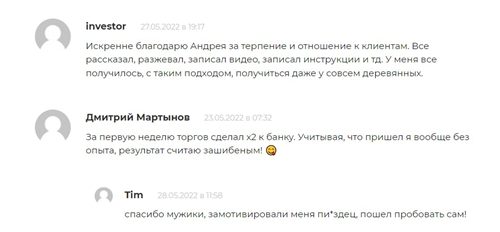Рисунок 2. Отзывы о трейдере Андрее Косенко с канала Торговец