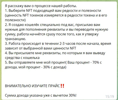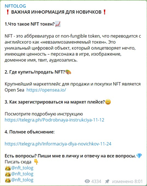 Основатель канала Телеграм NFTOLOG специализируется исключительно на торговле NFT токенами. Для новых подписчиков и неопытных людей в криптовалюте молодой человек в отдельном посте изложил всю необходимую информацию: