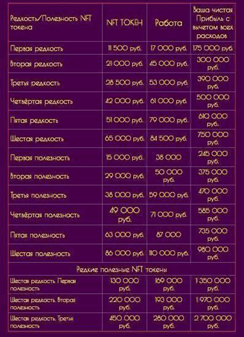 Инвестиции принимают от 11000 рублей до 450000 рублей. Доход напрямую зависит от уровня полезности токена и может составлять от 175000 руб. до 2 млн. 700 тыс. руб. После проведения торговой сессии клиент получает выплаты, с прибыли нужно отдать 30%.