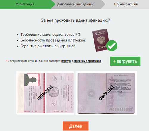 Вам следует загрузить цветную фотографию первой страницы паспорта, а также информацию о прописке. Нажмите зеленую кнопку “Загрузить”. После этого кликните на “Далее”. Завершительный этап - еще одна верификация, но уже для ЦУПИСа.