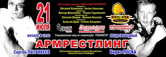 21 июля в дансинг клубе "Пати-Фон" пройдут очередные поединки Кубка Санкт-Петербурга по армрестлингу. В этот вечер состояться четыре поединка. Одним из самых интригующих должен стать поединок в легком весе между Антоном Алексеевым и Виталием Калмыковым.
