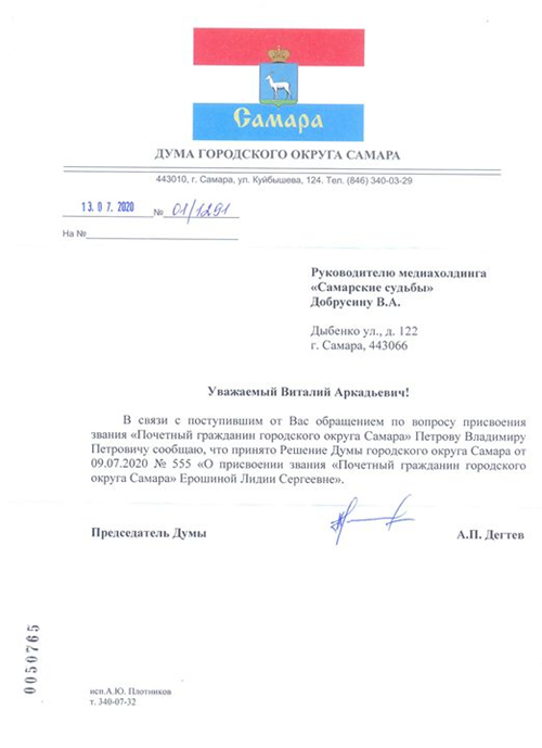 Честно говоря, непонятно, почему так упорствует городское начальство. Оно не среагировало даже на обращение Михаила Дегтярева, когда он был председателем Комитета по физкультуре и спорту Госдумы. Вот это письмо на имя главы города Самары Е.В.Лапушкиной, в котором поддерживается ходатайство медиахолдинга "Самарские судьбы":