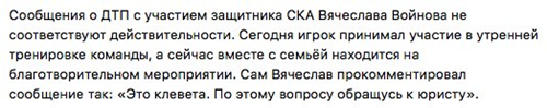 Хоккеист санкт-петербургского СКА Вячеслав Войнов назвал клеветой появившуюся в СМИ информацию о ДТП с его участием. Он заявил, что по данному вопросу обратится к юристу. Об этом сообщается в Twitter СКА. Отмечается, что игрок участвовал в утренней тренировке.