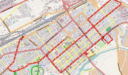 Огонь проследует по следующим улицам города: ул. Зорге (15:12-15:19), ул. Свердлова (15:19-15:23), ул. Пушкина (15:23-15:37), ул. Карельцева (15:37-15:41), ул. Гоголя (15:41-16:04), ул. Красина (16:04-16:12), ул. Куйбышева (16:12-16:45).
