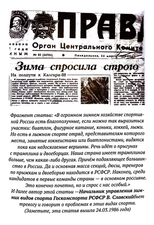 В подтверждение вышесказанного, приведу пример из личной биографии. Дело было на Играх Олимпиады в Сараево (тогда СССР занял второе место), где я находился будучи начальником управления зимних видов спорта Госкомспорта РСФСР. Еще шли игры, а в Москве мне уже готовили приказ на увольнение. И это при том, что мы не отвечали за подготовку сборных команд СССР. И, тем не менее, полетело много голов, а я получил выговор.