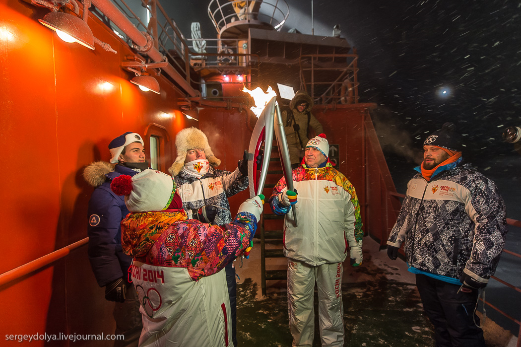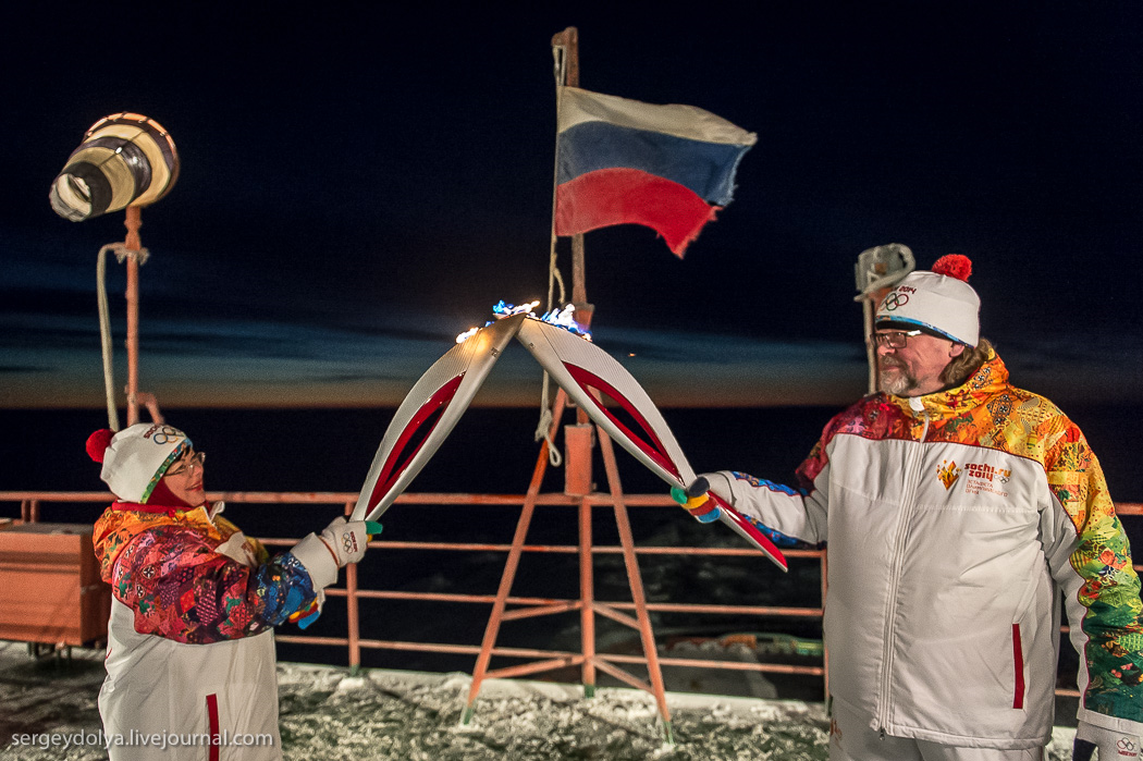 Впервые в истории олимпийский огонь Игр 2014 года, которые пройдут в Сочи, побывал на Северном полюсе. Атомный ледокол "50 лет Победы" достиг Северного полюса в условиях полярной ночи и установил рекорд скорости достижения этого места - 91 час и 12 минут.