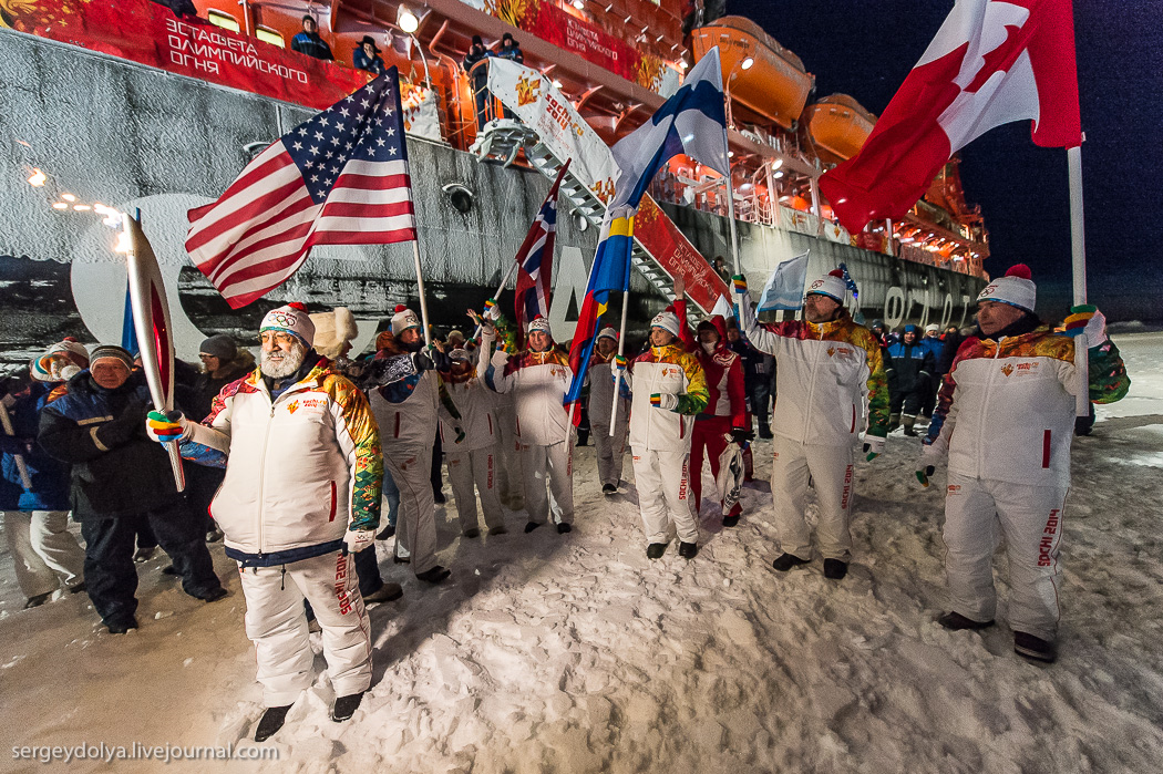 В этапе эстафеты на краю земли приняли участие представители 8 стран, входящих в Арктический совет - России, Норвегии, Финляндии, Швеции, Канады, США, Исландии и Дании.