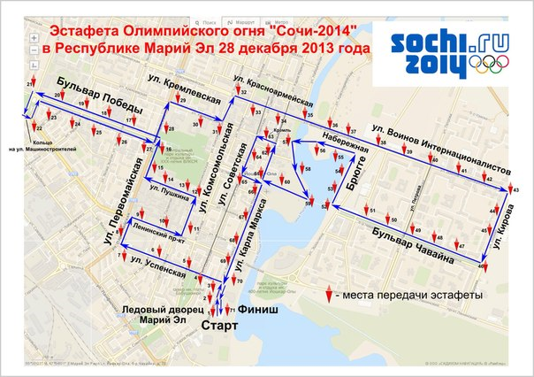 Маршрут эстафеты пройдет по центральным улицам города, площадям, набережной Малой Кокшаги. Финиширует эстафета у ледового дворца, где пройдут большие торжественные мероприятия.