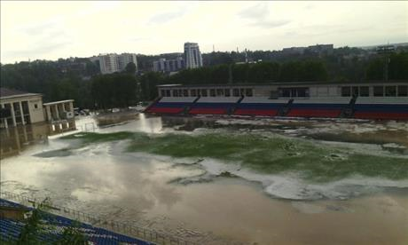Сегодня в Смоленской области обрушилась гроза, сопровождавшаяся ливнем и градом. В последствии этого стадион "Спартак", оказался затопленным, сообщает "Советский спорт".