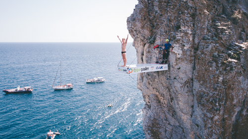 Клифф-дайвинг - экстремальный вид водного спорта, представляющий собой прыжки с отвесных скал в естественные водоемы. В Крыму трамплин для прыжков установили на высоте 27 метров на одной из самых известных природных достопримечательностей - скале Дива, расположенной на Южном берегу полуострова. Чтобы попасть на трамплин, спортсмены использовали страховку, демонстрируя навыки профессиональных альпинистов.