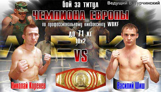3-кратный чемпион мира (WAKO-PRO), чемпион Европы 1998г по кикбоксингу Николай Коренев по прозвищу «Женьшень» (Украина, г. Сумы) против 3-кратного чемпиона мира, 2-кратного призера чемпионата мира, Интерконтинентального чемпиона, 2-кратного чемпиона Европы по тайскому боксу Василия Шиша по прозвищу «Шиш» (Белоруссия, г. Минск)