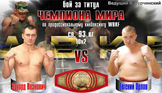 Обладатель титула чемпион мира (WBKF), 2-кратный чемпион России по кикбоксингу, финалист турнира Ка-1 2003г., вице-чемпион Европы (версия “Драка”) 2005, чемпион России 2000 по тайскому боксу, чемпион России по боям без правил Евгений Орлов по прозвищу «Молекула ада» (Россия, г. Санкт-Петербург) будет отстаивать титул в бою против чемпиона мира 2003, чемпиона Европы 2002 по тайскому боксу, 2-кратного чемпиона Европы (WBKF), 3-кратного чемпиона Белоруссии по кикбоксингу, чемпиона Белоруссии 2001, победителя Кубка Белоруссии 2001 по рукопашному бою Эдуарда Возновича по прозвищу «Адвокат дьявола» (Белоруссия, г. Минск)