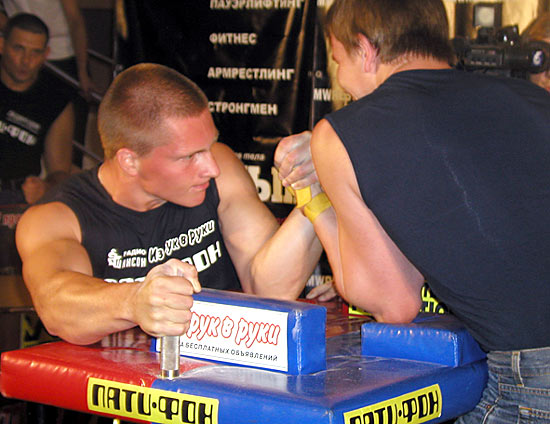 В первом раунде рукоборцы обменялись взаимными любезностями, Алексеев был лучшим на левых руках, а Калмыков на правых.