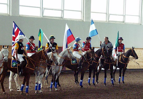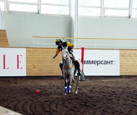 Первый поло-турнир носил показательный характер. Русского зрителя и потенциального игрока в поло надо познакомить с этим видом спорта. В турнире приняли участие команды «Альфа-банка» и «Группы ЕСН». Из-за плохой погоды и неудовлетворительного состояния поля игру пришлось перенести в закрытое помещение с песчаным покрытием. По правилам, установленным для профессиональных турниров на поле выходят по четыре игрока от каждой команды, а сама игра состоит из 6-8 чакк (раундов) продолжительностью по 7 минут, перерыв между чакками составляет три минуты. Так как Московский турнир был показательным, то игра заняла гораздо меньше времени: всего 4 чакки, а на поле было по два игрока от каждой команды.