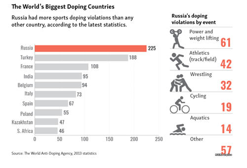 P. S. Когда эта статья уже была написана, вспомнил, как было неприятно видеть "наглядную агитацию" ВАДА. Взгляните и вы. Правда, это за 2013 год, и речь идет о летних видах спорта. Но сути дела не меняет! Можно и нужно было тогда в России всерьез взяться за дело борьбы с допингом. Но что вышло, то вышло. И еще… Обратите самое пристальное внимание на список стран. Он тоже об очень многом говорит.